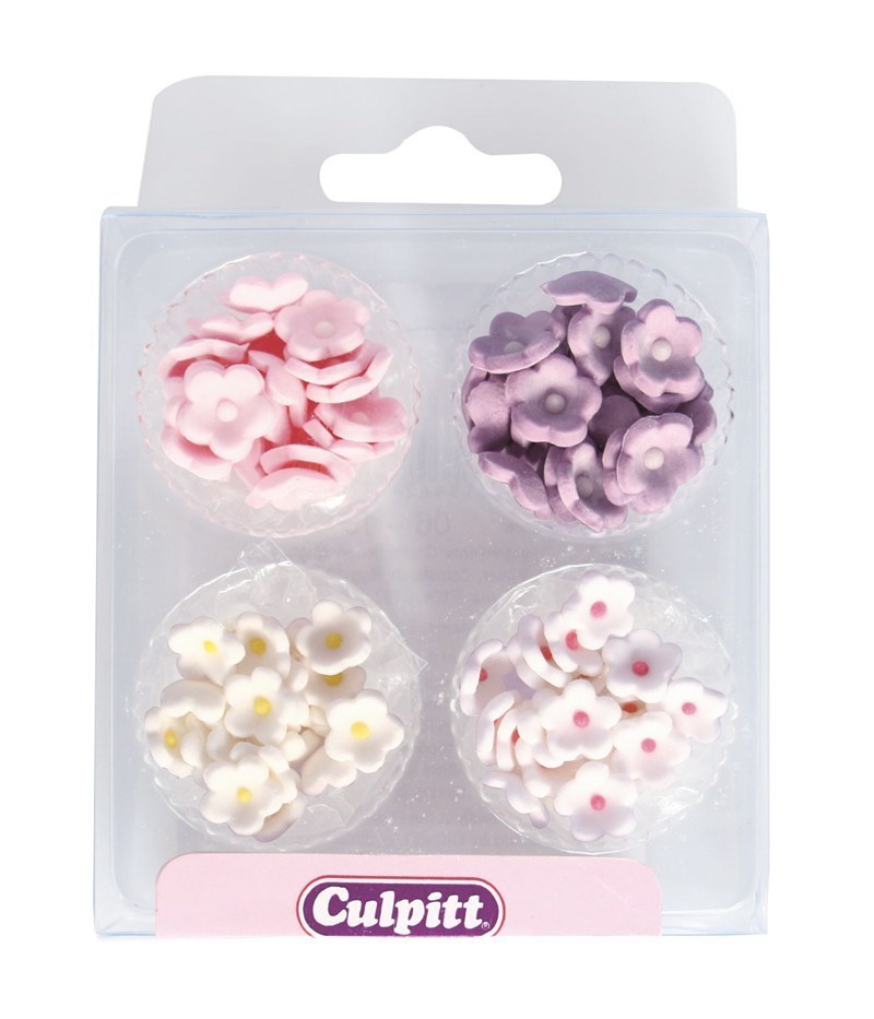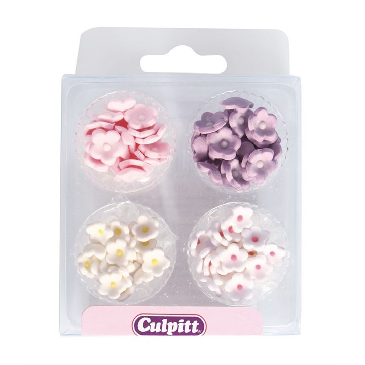 A mixture of 6 and 10mm flowers made from a hardened sugar paste with a piped centre. There are 100 flowers per pack