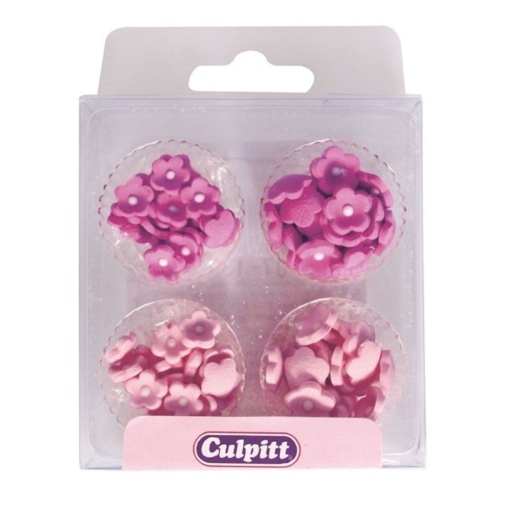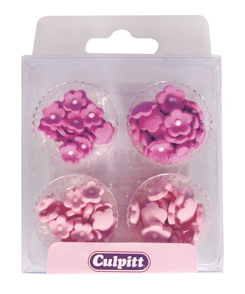 A mixture of 6 and 10mm flowers made from a hardened sugar paste with a piped centre. There are 100 flowers per pack