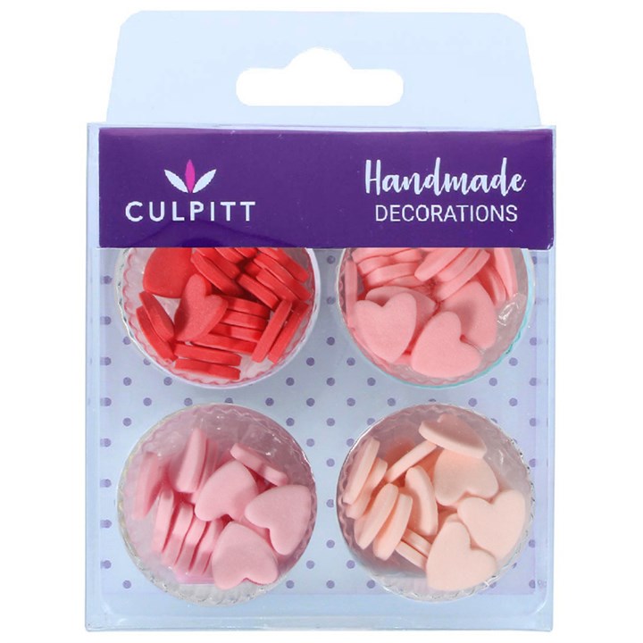 These decorations include hearts in varying shades of pink and red. Ideal for cupcakes, cakes and cookies, these sugar decorations are completely edible and very easy to use.