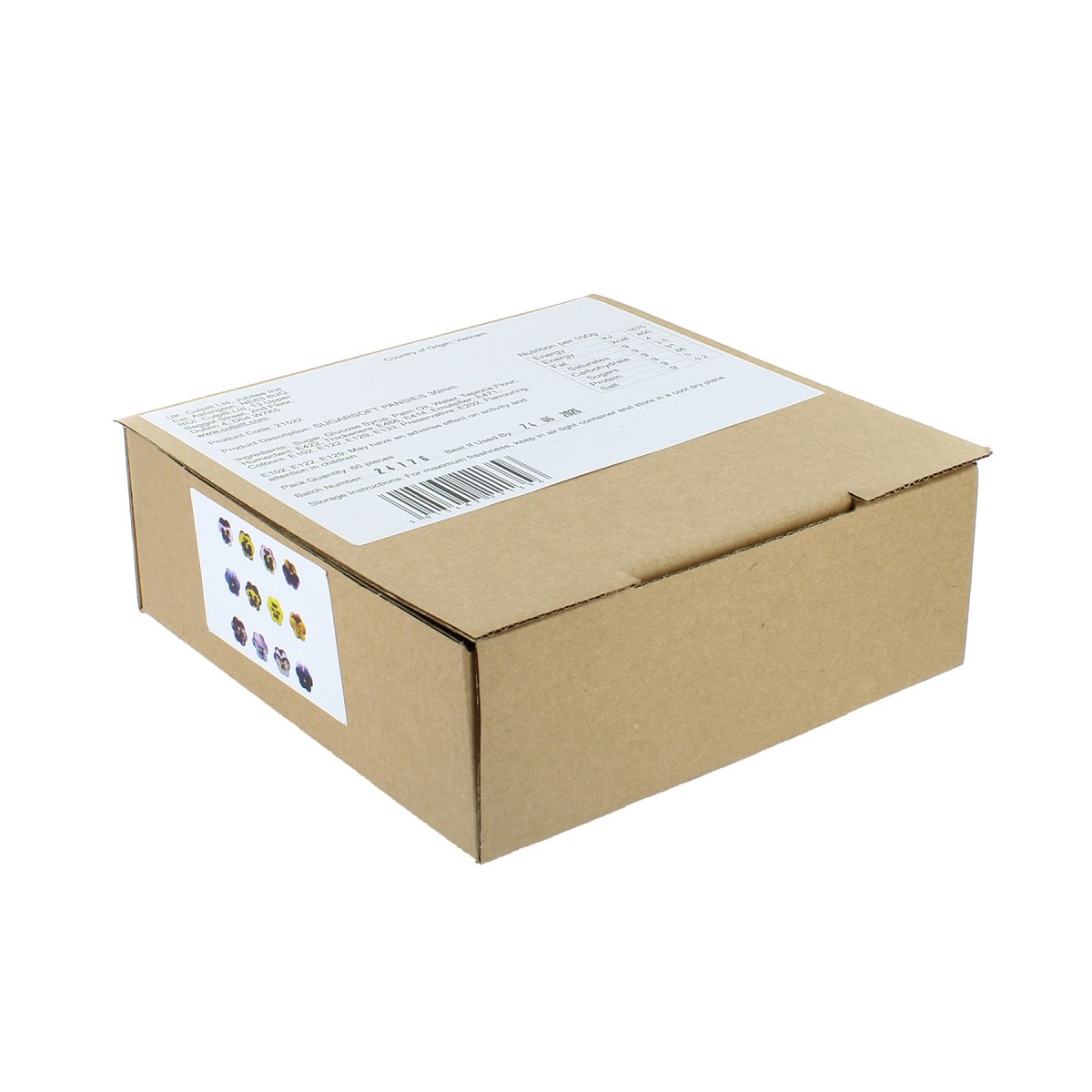 Sugar; glucose syrup; tapioca flour; water; palm oil; humectant: E422; thickeners: E466, E414; emulsifier: E471; colours: E102, E122, E129, E133; preservative: E202; flavouring
