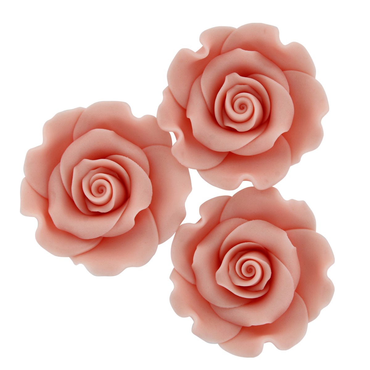 Beautiful handmade sugar roses in pink, perfect for adding as a finishing touch to a wedding or special occasions cake. Made from a soft sugar paste, these edible sugar roses havee a pleasing texture and light vanilla flavour.