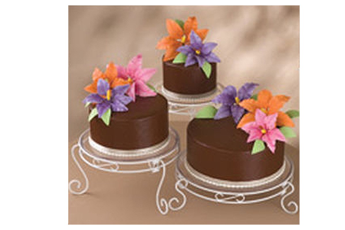 Elegance and versatility all in one cake stand set! Three different stand sizes and removable scroll legs allow multiple combinations of cake set-ups. The elegant white finish and clear plates will complement any cake design for a perfect creative display. Also a beautiful way to serve cupcakes, appetizers and other party foods.