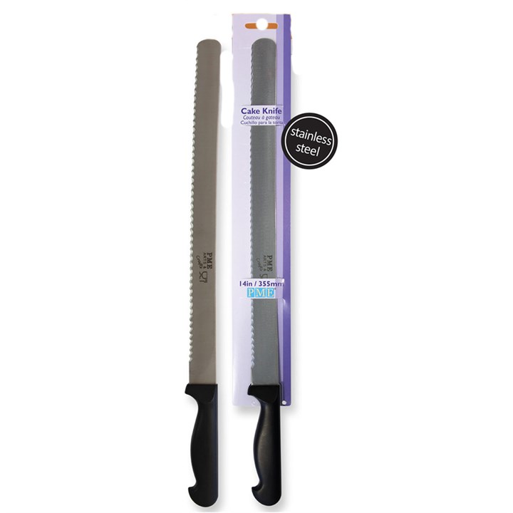 This 14'' bladed knife comes totally protected in its own packaging, and will slice up to a 11'' cake. It has a stainless steel blade with a black plastic handle.