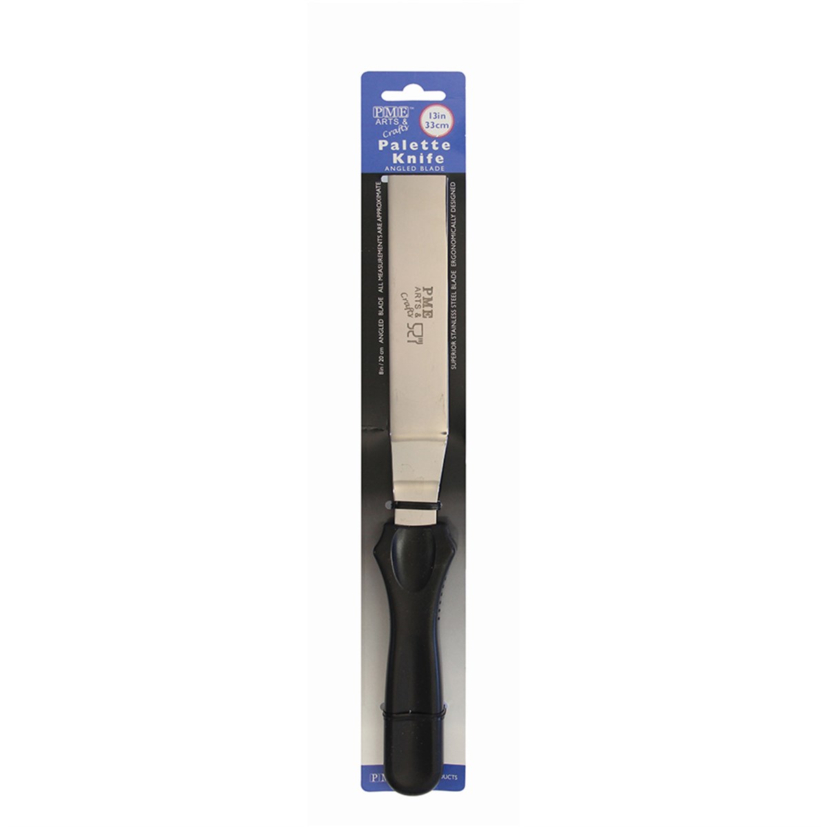 This is a superior quality 8'' round angled stainless steel blade. Ergonomically designed handle with thumb grip for comfort and ease of use. Dishwasher safe. The total length of the palette knife - including the handle is 13''.