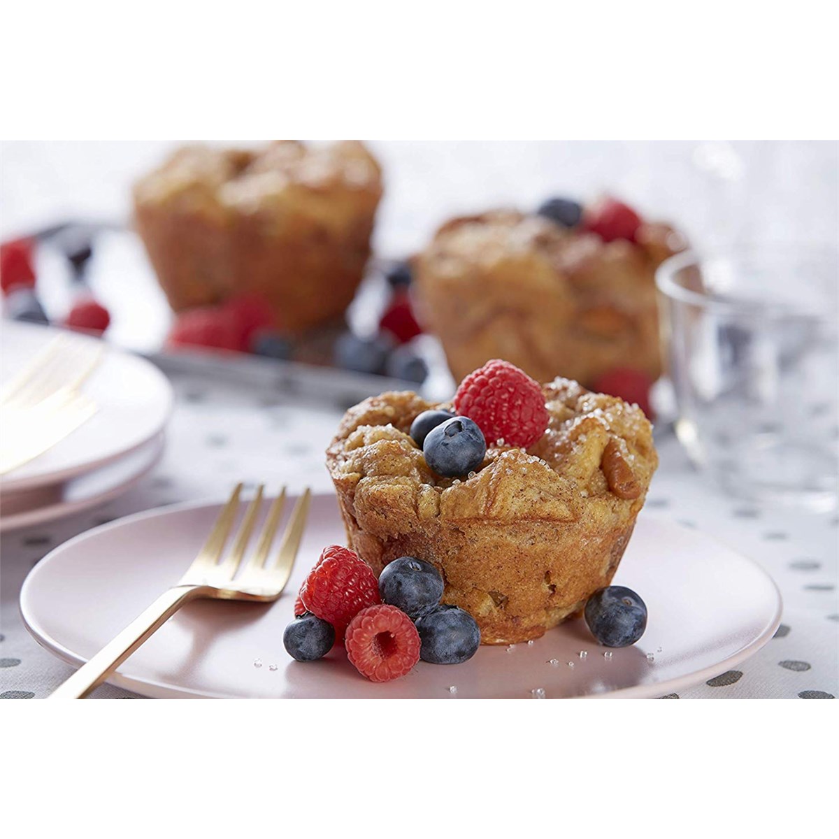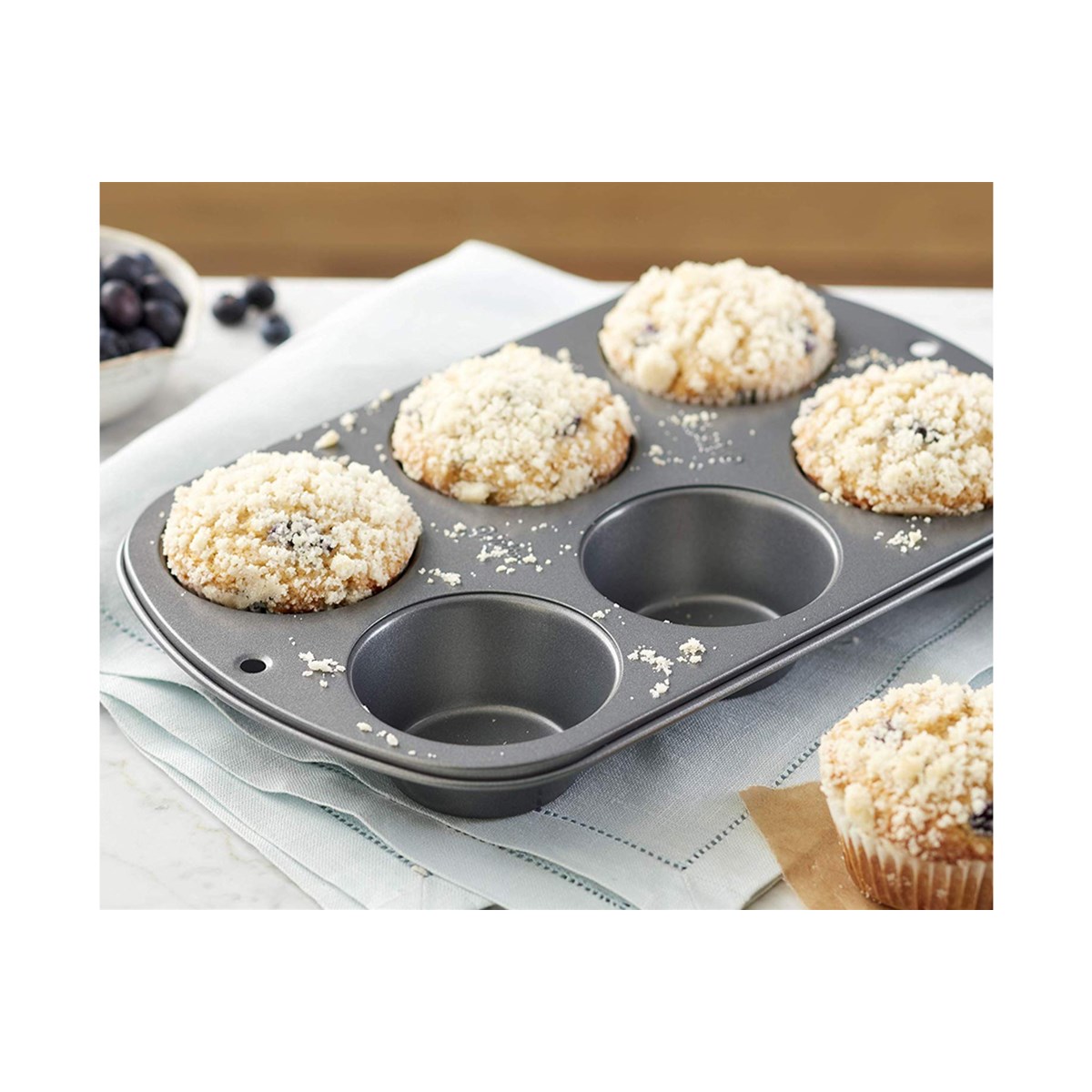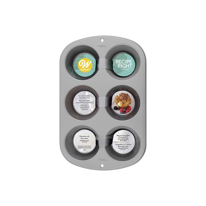 The Recipe Right Jumbo Muffin Tin by Wilton is constructed of heavy-gauge steel that provides an even-heating performance, baking experts prefer for perfectly-browned baked goods. The non-stick coating makes food release and clean-up a breeze.