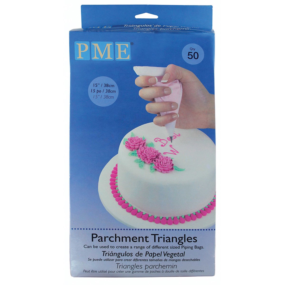 Pack of 50 strong parchment triangles, very handy to keep at home to make piping bags of various sizes. Ideal for royal icing, buttercream, chocolate and candy. May be used with or without an adaptor / coupler and piping nozzle.