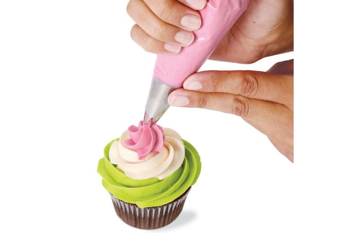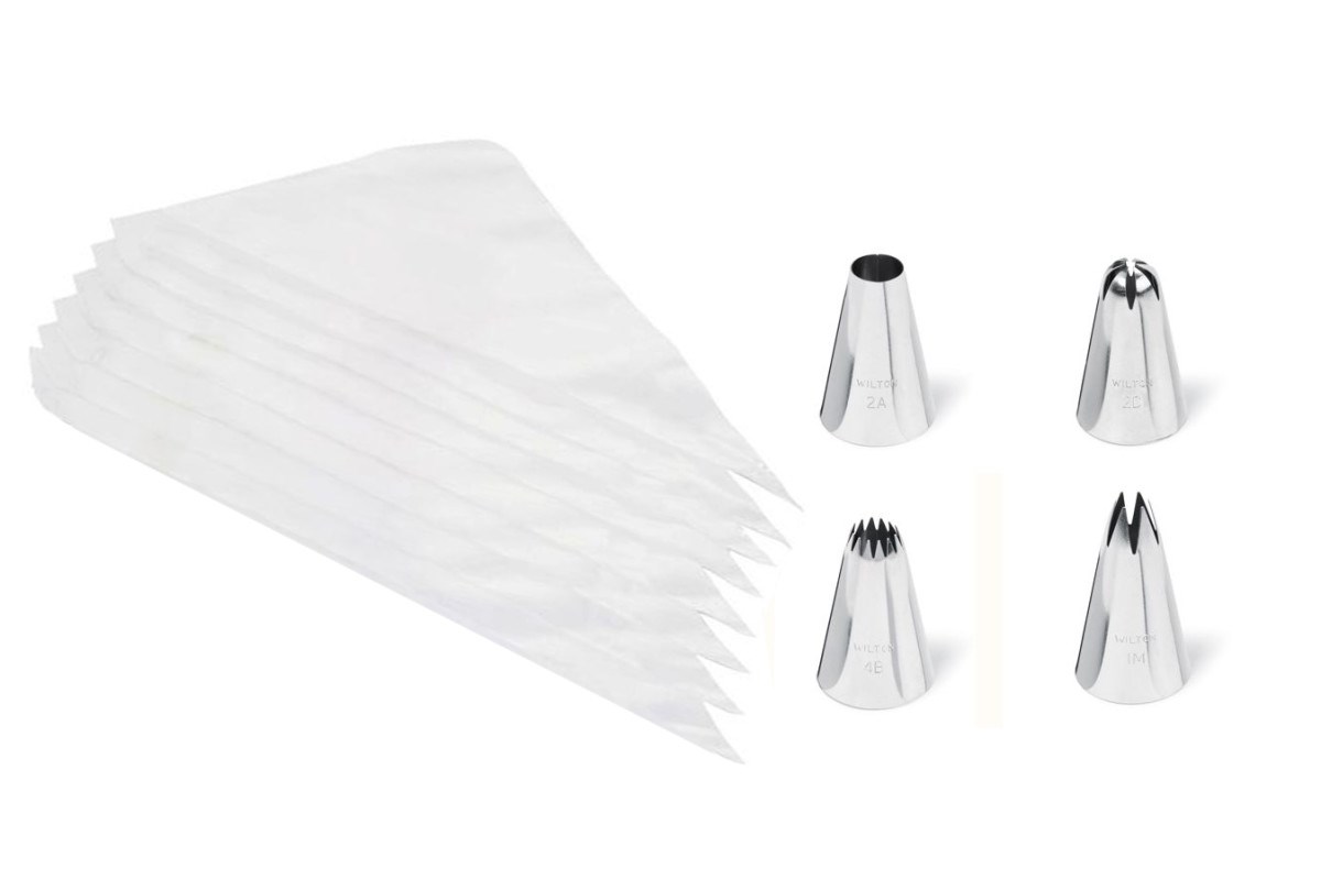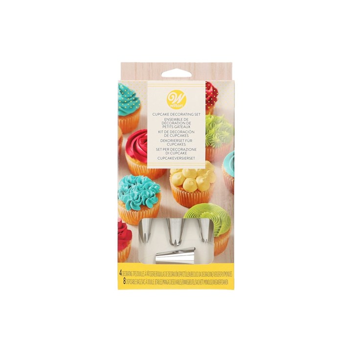 Decorate your cupcakes easily with the most beautiful designs with this handy decorating set from Wilton. Perfect for decorating cupcakes for a party or other occasion. Contains 8 disposable piping bags, and 4 tips - Star Tip 1M (rose, star, drop flower), Round Tip 2A, Drop Flower Tip 2D and Star Tip 4B.