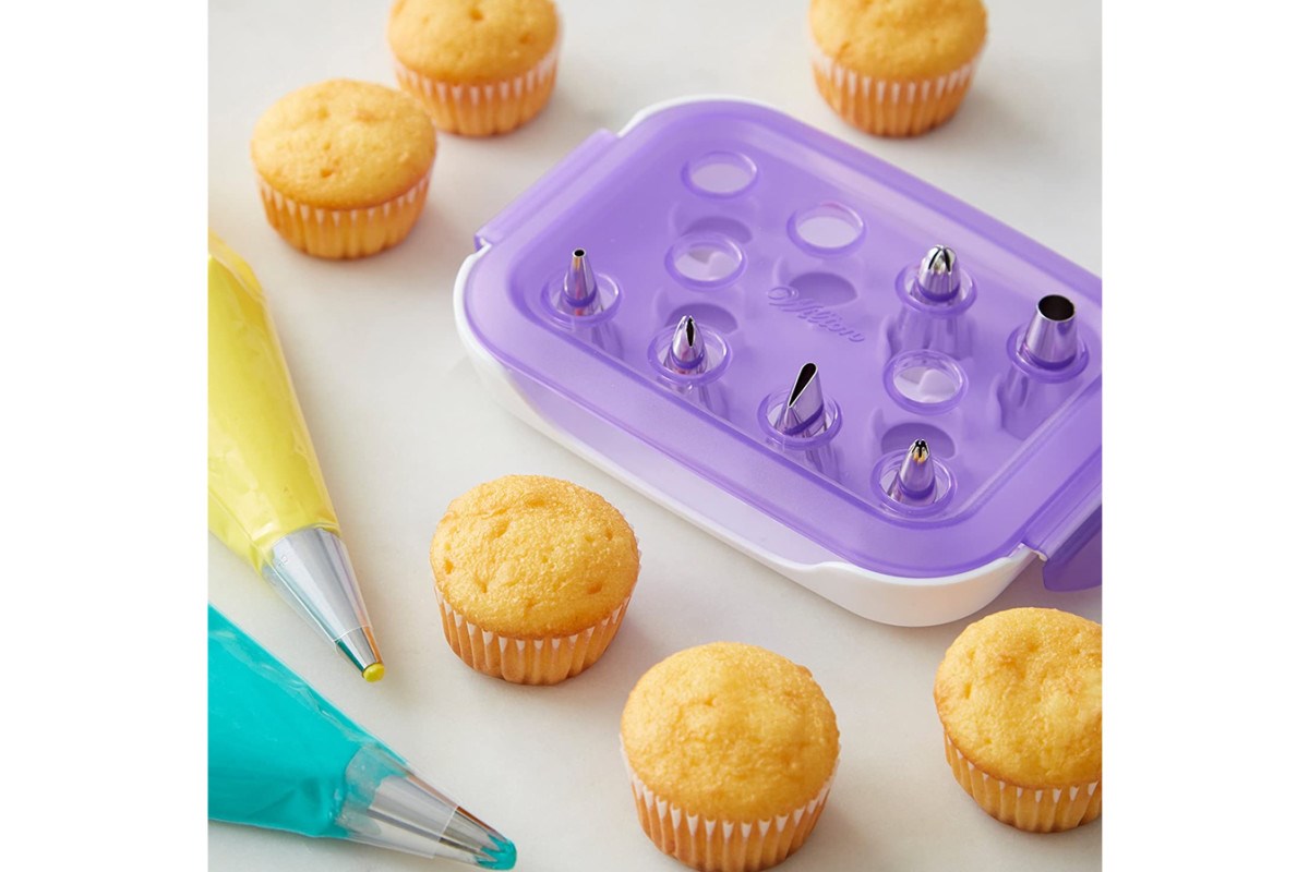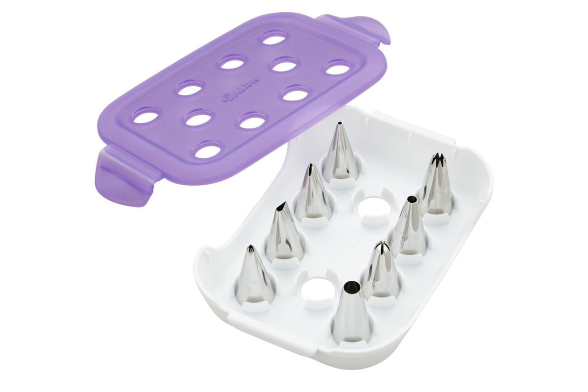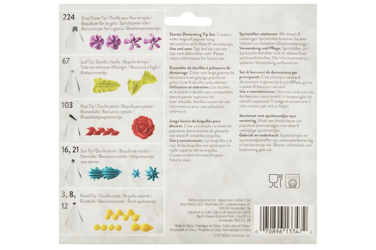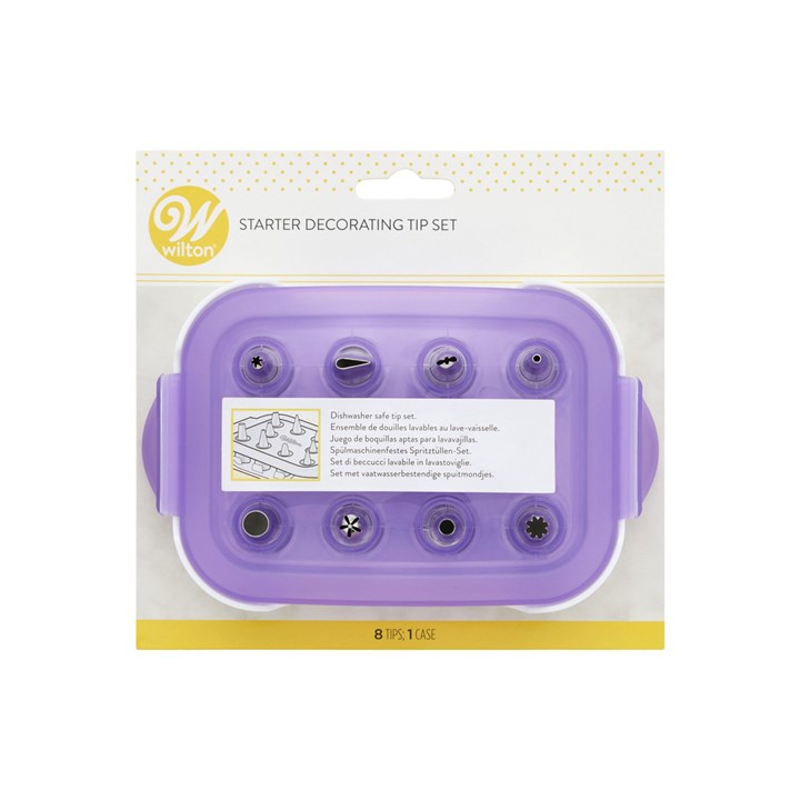 Decorate cupcakes, cookies, cakes and more with the Wilton 9-piece Starter Decorating Tip Set. With three sizes of round tips, you can write, make multi-sized dots and pipe lines in fine, medium and large. Use the two star tips to make stars, shells, zigzags and more. Pipe flowers with the drop flower tip and add leaves using leaf tip. Make individual petals, roses, ruffles and more with petal tip. Plus, all of the tips store away easily in the storage case.