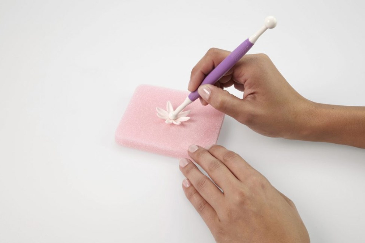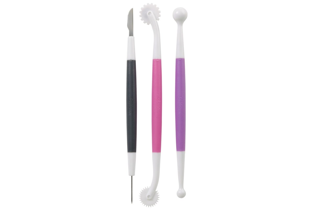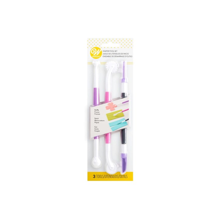 Working with fondant is easier with the Fondant and Gum Paste 3 piece Starter Tool Set. Three double-ended tools make it easy to shape, detail and cut your fondant or gum paste. The ball tool has a large ball on one end and a small ball on the other, balls are used to shape or ruffle the edges of flower petals and ribbons. Use the fine and wide quilting or stitching rolling wheels to imprint dotted or dashed details in your fondant. The knife and needle tool has a blade at one end and a pointed pick at the other, use the knife end to cut and trim small decorations while the needle end can be used for single dot patterns or for releasing air bubbles from rolled-out fondant.
