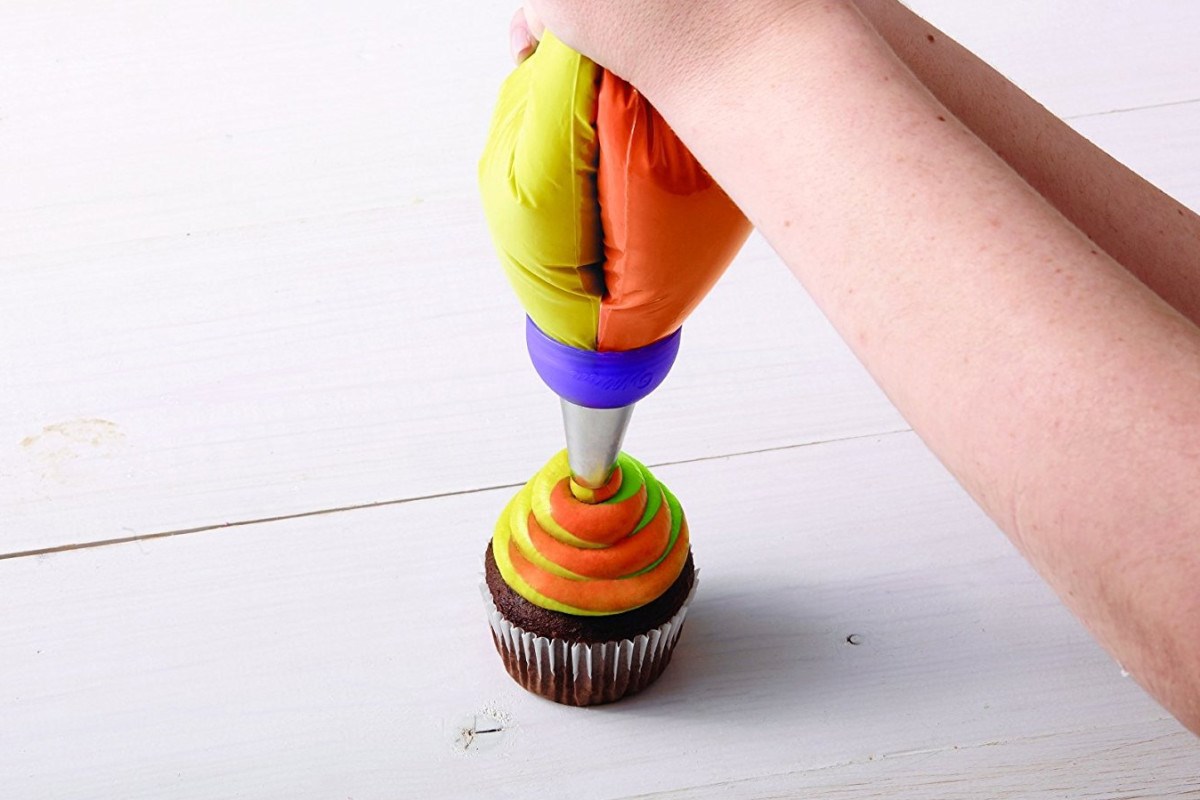 The Colour Swirl 3-Colour Coupler seamlessly blends 2-3 colour icings as you pipe. Choose from double swirl or triple swirl colours. The interlocking coupler pieces connect multiple decorating bags, allowing you to swirl 2 or 3 colours together with one simple piping motion. Just connect and secure with the included ring. Perfect for cupcakes. Works with large tips1 m1a 2C and 4B and 16 inch decorating bags (sold separately). This package contains three colour couplers and one cap to connect them. Hand wash only