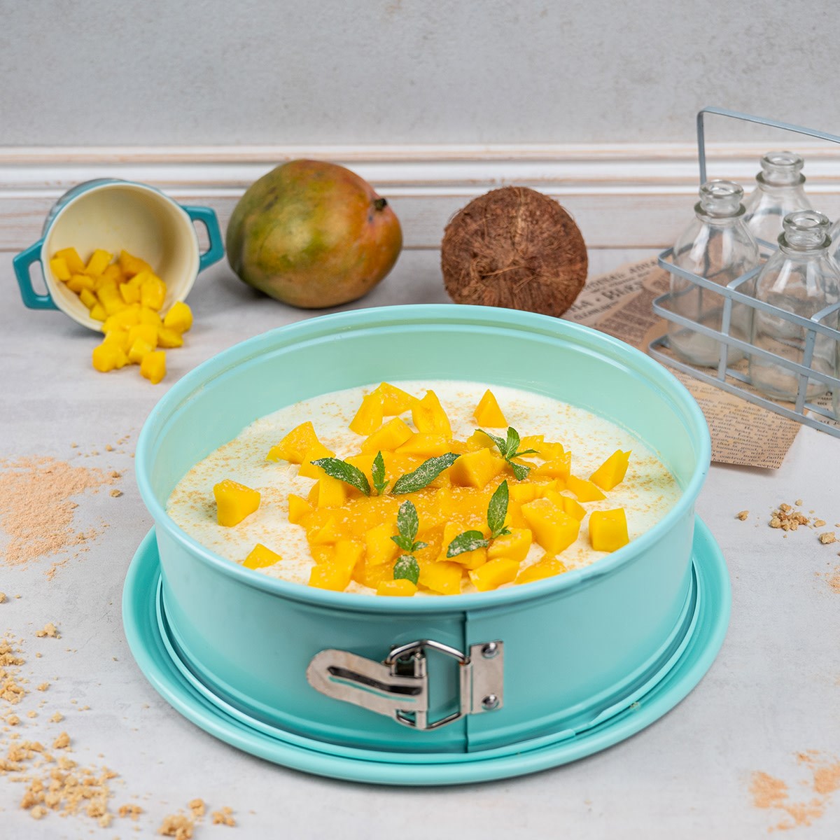 Featuring details such as a curved stainless steel clasp and the extra emphasized, rounded edges, this Decocino springform pan with a diameter of 260mm is made of carbon steel and sealed all around with a non-stick coating in mint, including on the inside and underside.