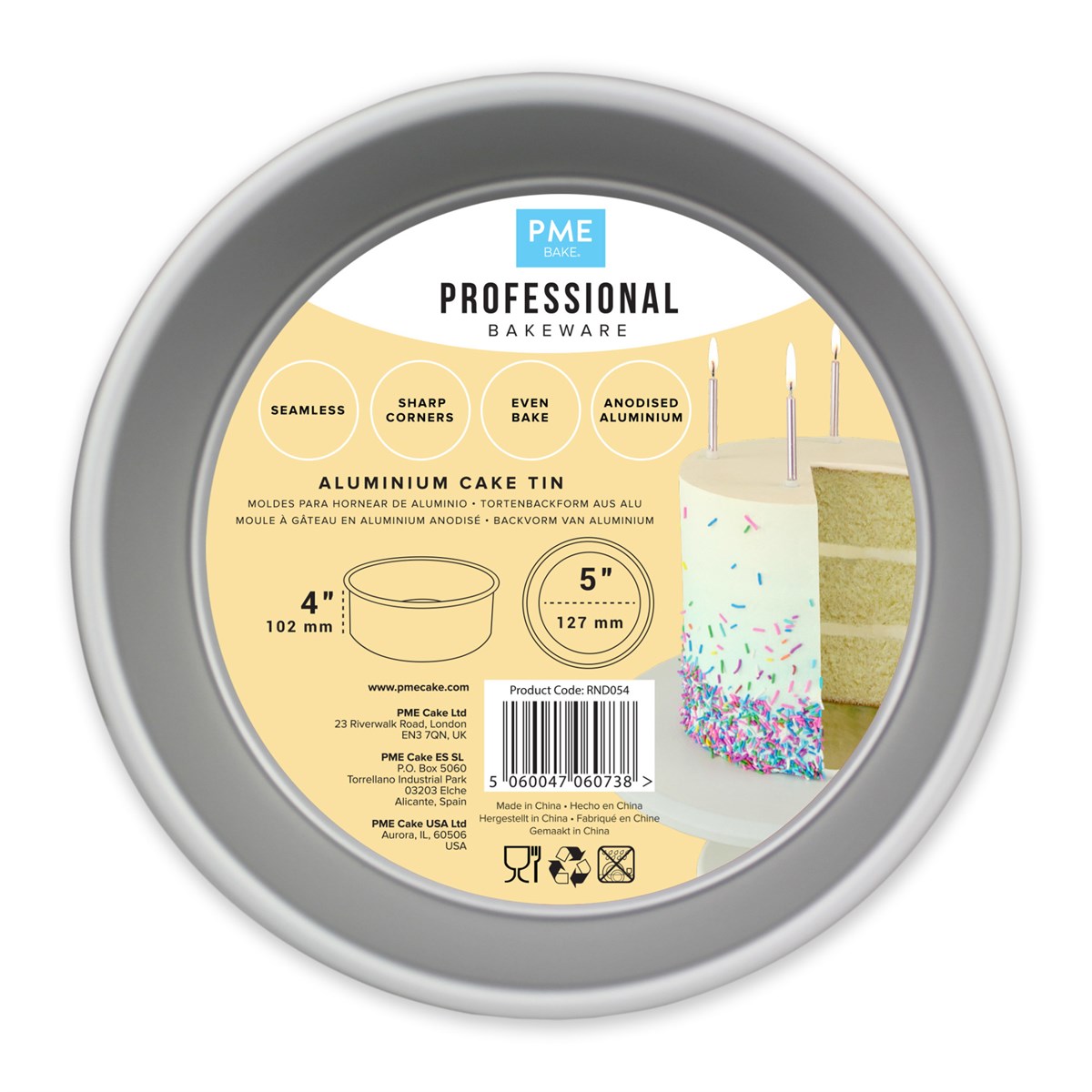 5'' Seamless anodised aluminium tin. Professional quality, straight sides with no seams. Top hemmed rim for strength and durability. 5'' diameter x 4'' deep.