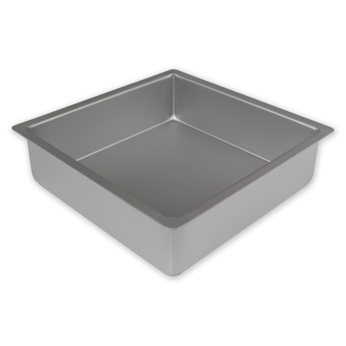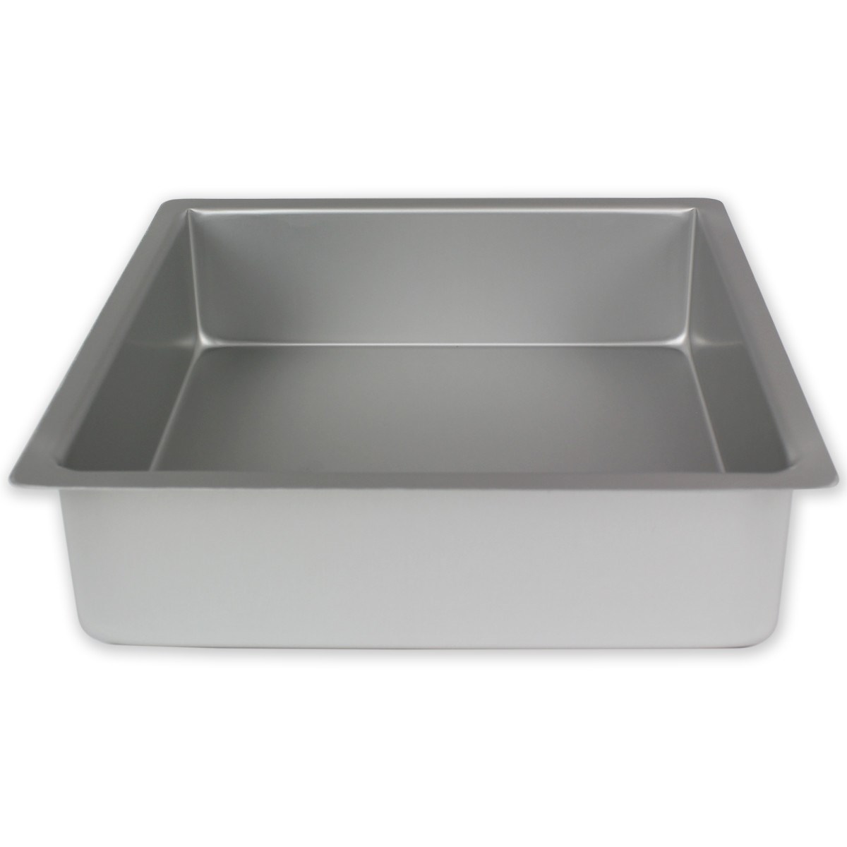 14'' Seamless anodised aluminium tin. Professional quality, straight sides with no seams. Top hemmed rim for strength and durability. 14'' square x 3'' deep.