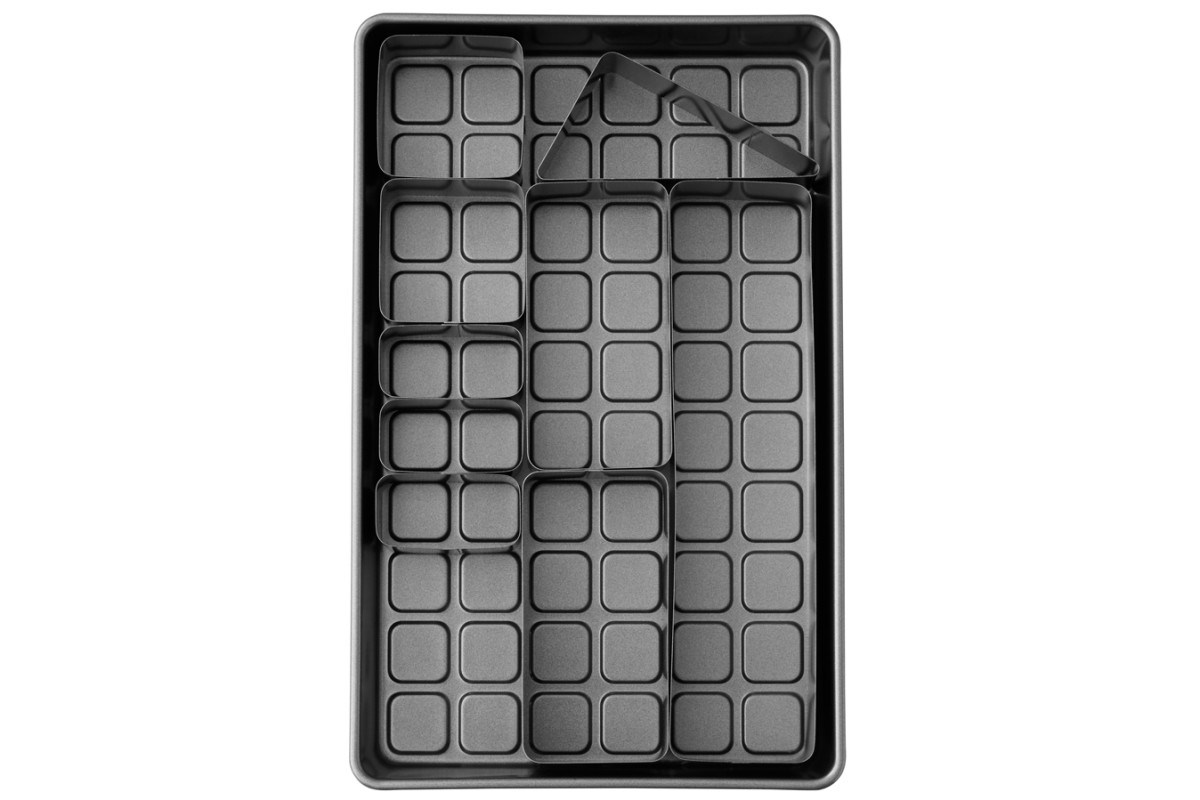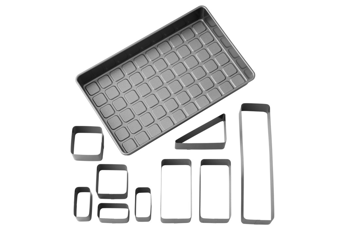 The 14.5 x 9-inch rectangular cake pan has a grid bottom that holds the inserts securely and prevents batter from seeping through. Great for sports-themed parties, monogram cakes, graduations, anniversaries, and milestone birthday celebrations.