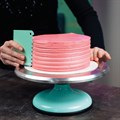 The Decocino Mint Edition Card Set includes; Rounded card - The perfect way to completely remove dough from rounded bowls and mixing jugs.Trapezoidal flat edged card - Perfect for cutting, dividing, and smoothing cakes, batter and Shaped jagged card - Offers three decoration options for wave and zigzag patterns