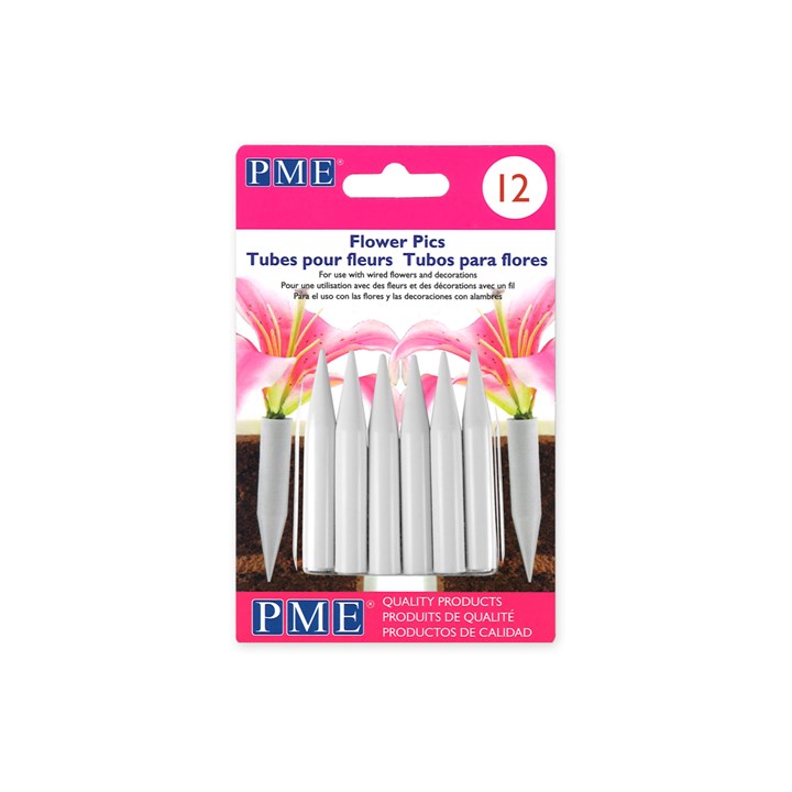 PME Flower Pics are the ideal holder for wired edible and non edible decorations.The perfect way to secure wired sugar flowers and wired cutout shapes into decorated celebration cakes, cupcakes and desserts. White plastic flower spikes, for use with fresh flowers, sprays with wired stems for safe insertion into cakes.