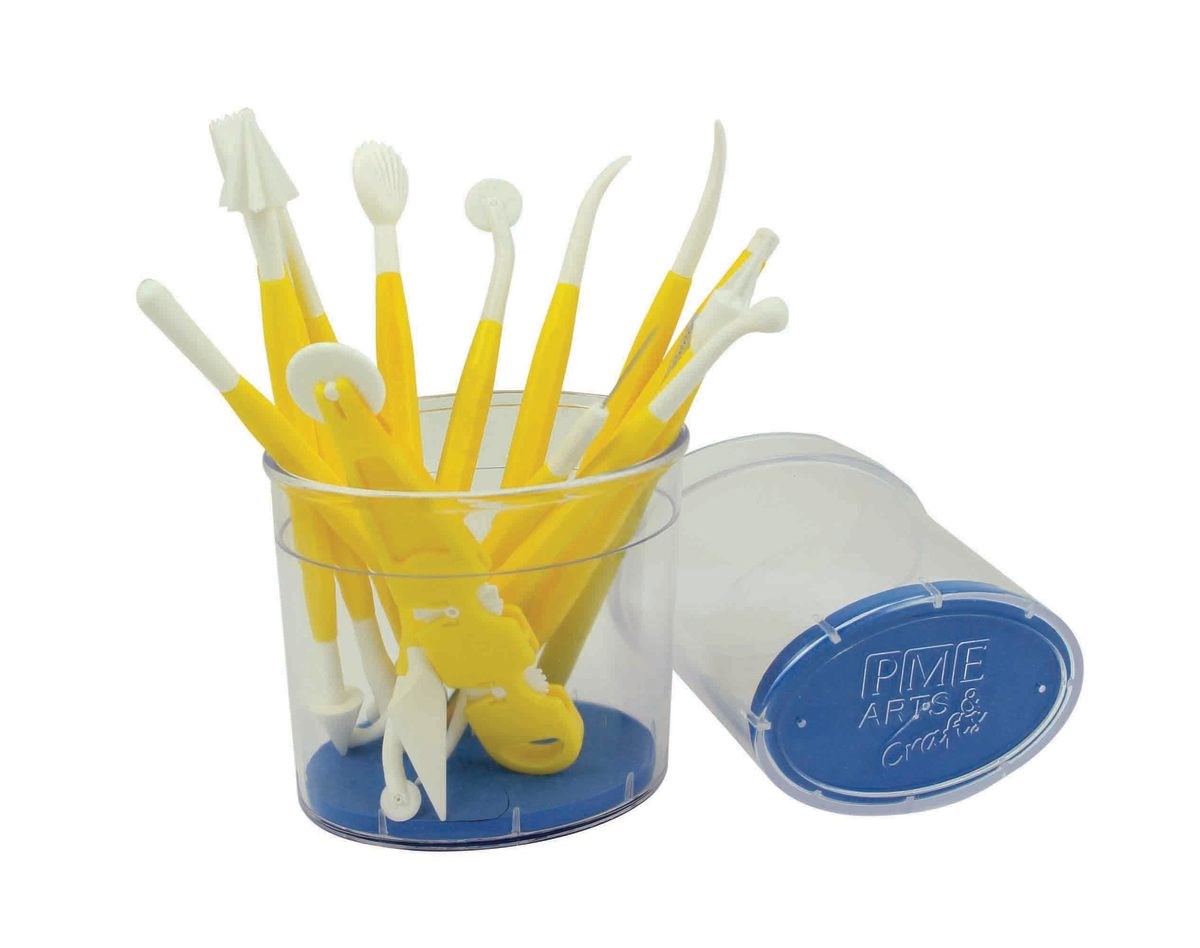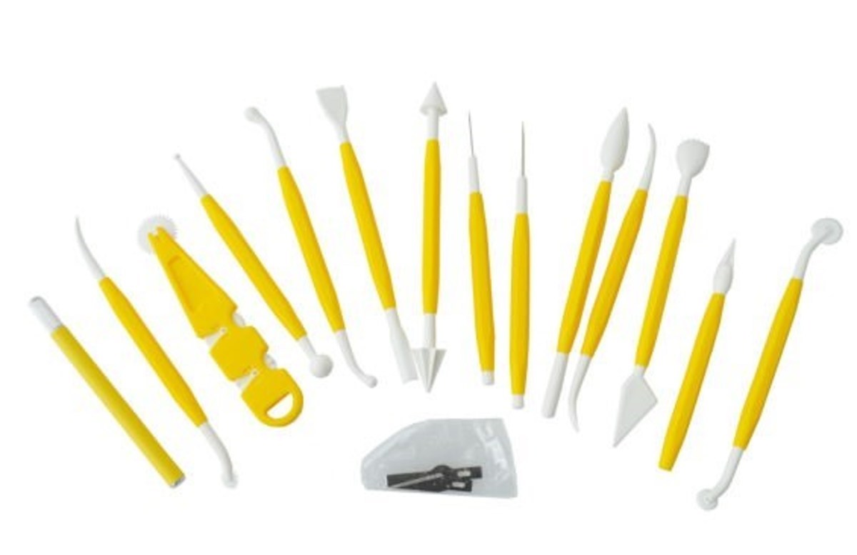 Set Contains: Scriber needles - thick and thin, Sugarcraft Knife with sharp cutting and ribbon insertion blades, One ended 6 star Taper Cone, Bulbous Cone, Flower / Leaf Shaper, Designer Wheel with 3 wheel options, Quilting Tool, Double Ended Cutting wheel, Serrated and taper Cone, Scallop and Cone, Bone, Blade and Shell, and Ball Tools.