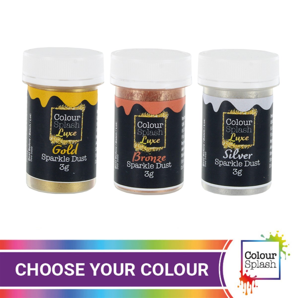 The range of edible products from Colour Splash Luxe creates specialty finishes for the most luxurious of celebrations. From shimmering pearls to glitzy metallics, Colour Splash Luxe brings the pzazz to any edible creation!