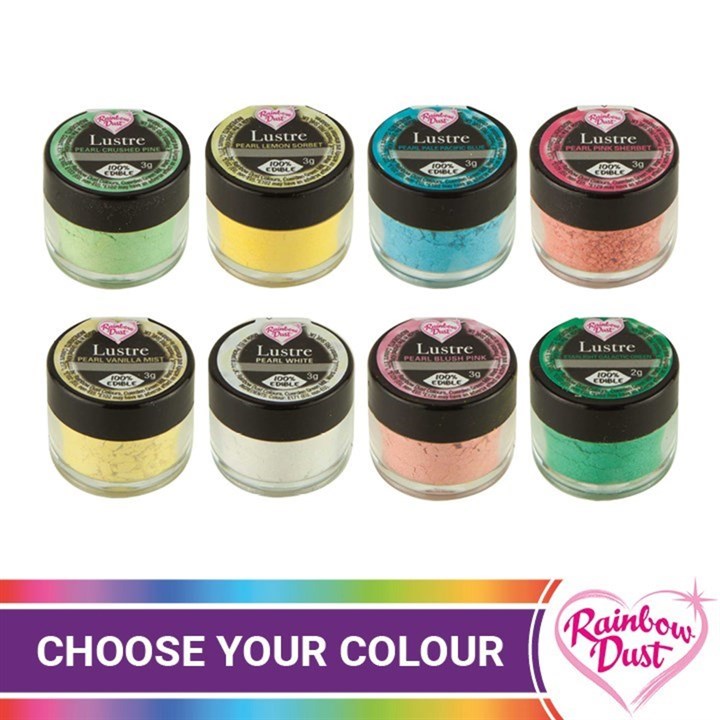 Rainbow Dust Edible Pearl Lustres are a range of silk dusting colours that give your products the eye catching and distinctive look they deserve.