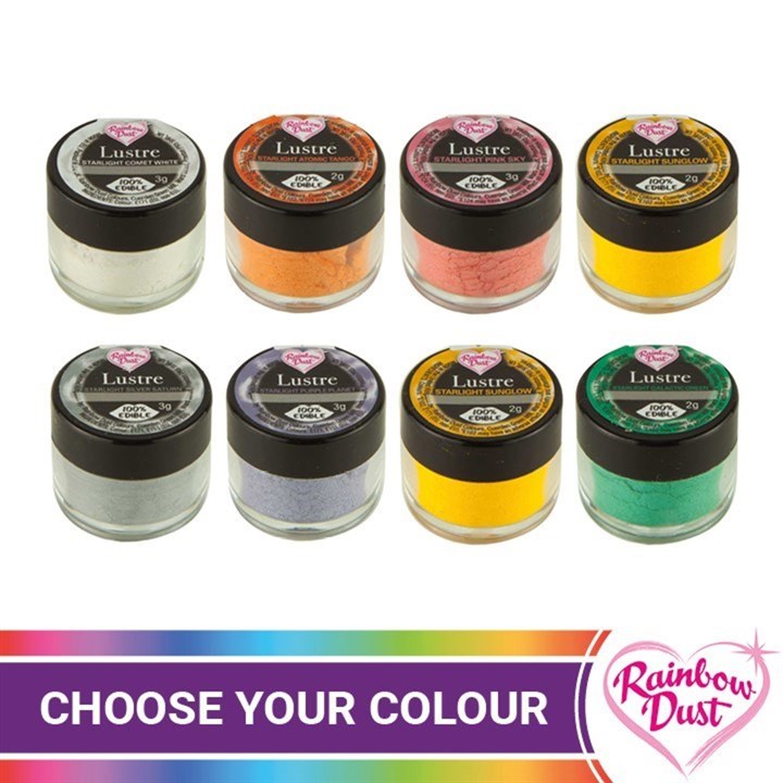 Rainbow Dust Starligth Lustre Range dusting colours are a unique and exquisite range of food grade pigments developed to give your products the eye catching and distinctive look they deserve.