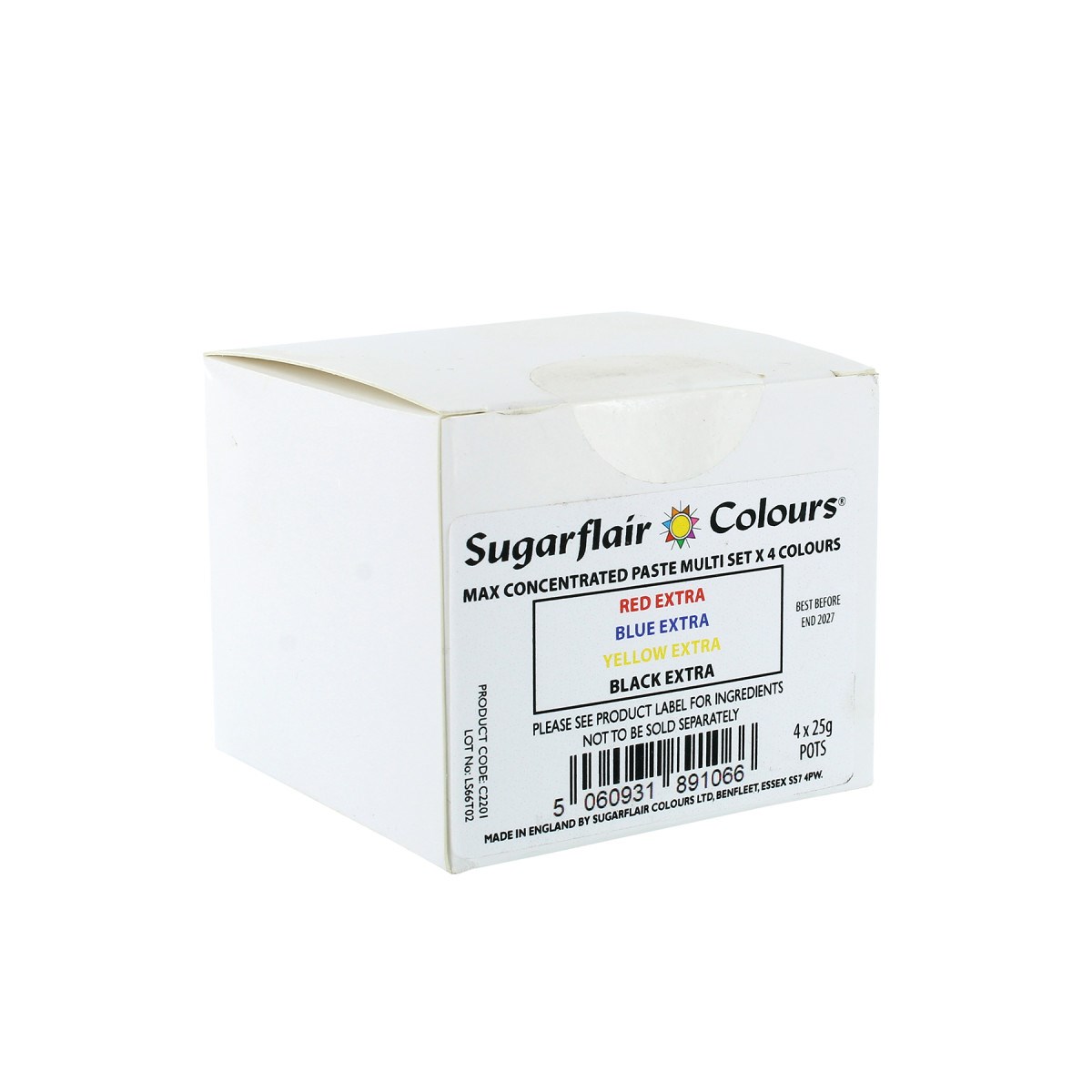 RED EXTRA: Humectant: E422 glycerol; water; thickener: silica E551; colours: E124 ponceau 4R, E129 allura red. BLUE EXTRA: Humectant: E422 glycerol; water; thickener: silica E551; colours: E133 brilliant blue, E122 carmoisine. YELLOW EXTRA: Humectant: E422 glycerol; water; thickener: silica E551; colours: E102 tartrazine, E104 quinoline. BLACK EXTRA: Humectant: E422 glycerol; water; thickener: silica E551; colours: E133 brilliant blue, E124 ponceau 4R, E104 quinoline yellow.