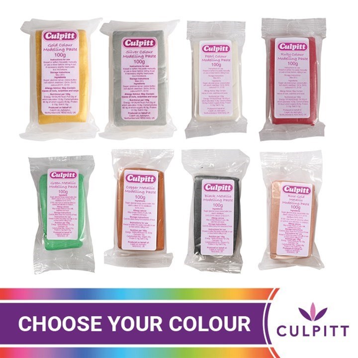 Our unique range of Culpitt Metallic Modelling Paste is a great way to create handmade decorations with a luxurious and premium finish. The easy to use paste can be formed into flowers and figures or used with moulds. Available in a great range of metallic shades including classic colours such as gold and silver along with new popular shades such as Rose Gold and Copper.