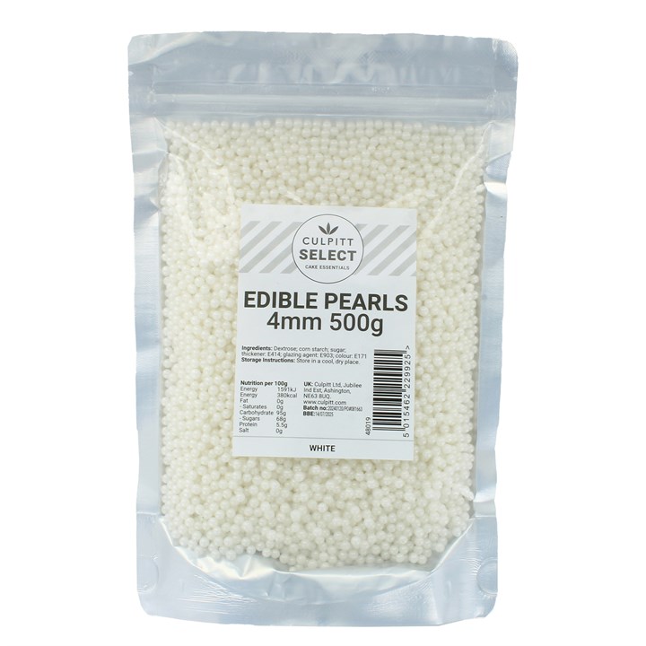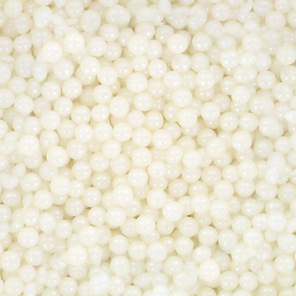 Culpitt Select 4mm white pearl sprinkles are a quick, cost-effective cake topping for professional cake decorating.