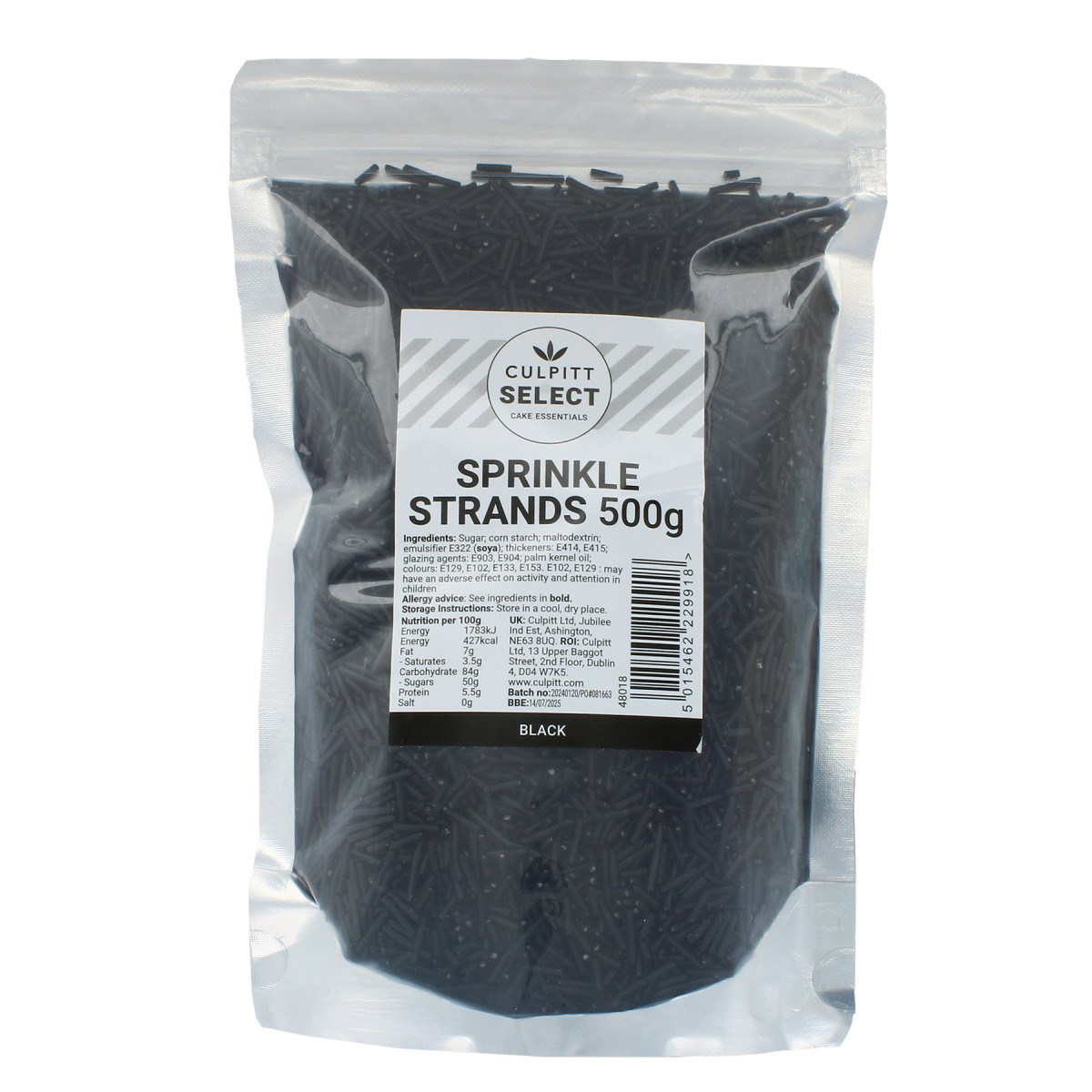 Culpitt Select black sprinkle strands are a quick, cost-effective cake topping for professional cake decorating. They are commonly used as the base for the best hundreds and thousands sprinkle mixes.