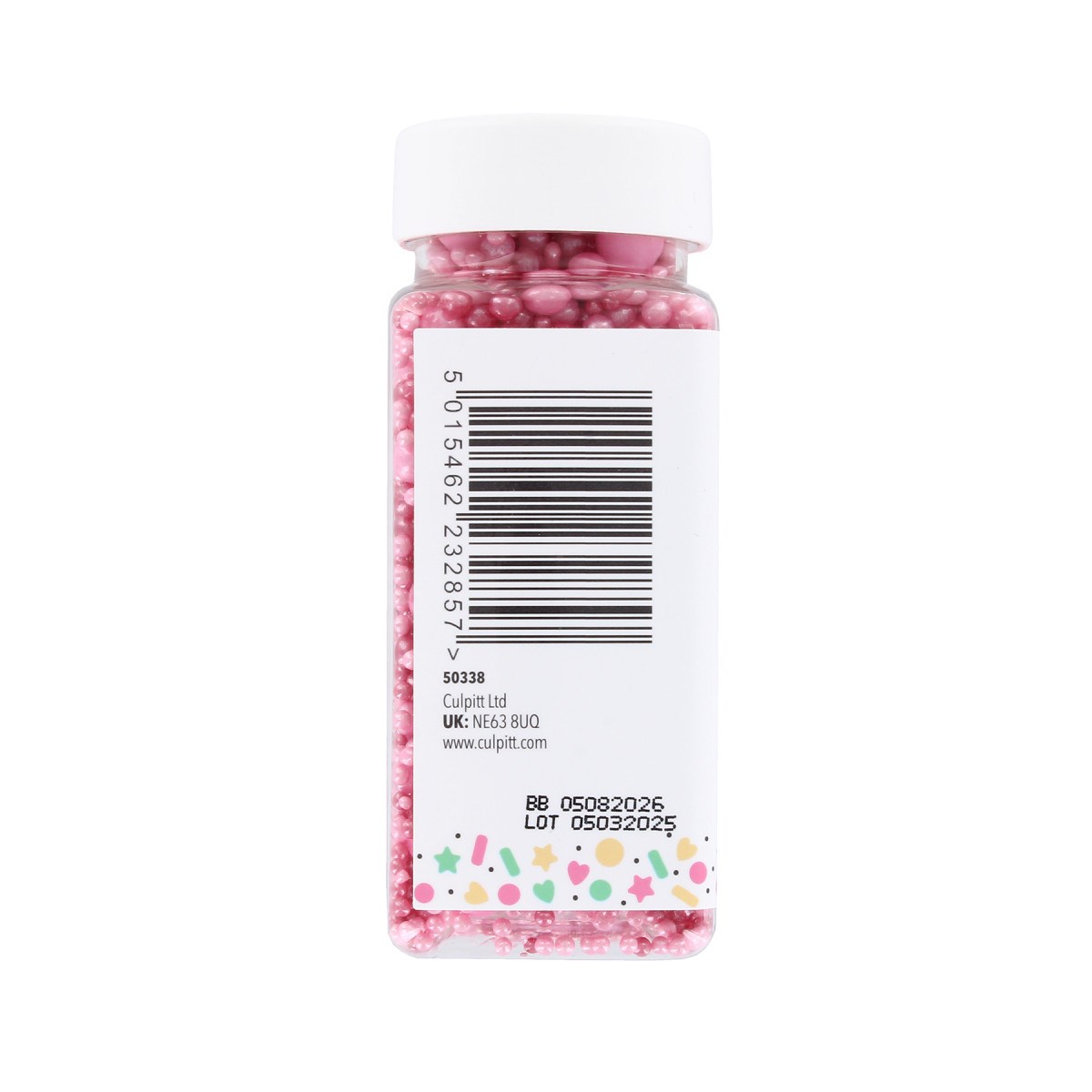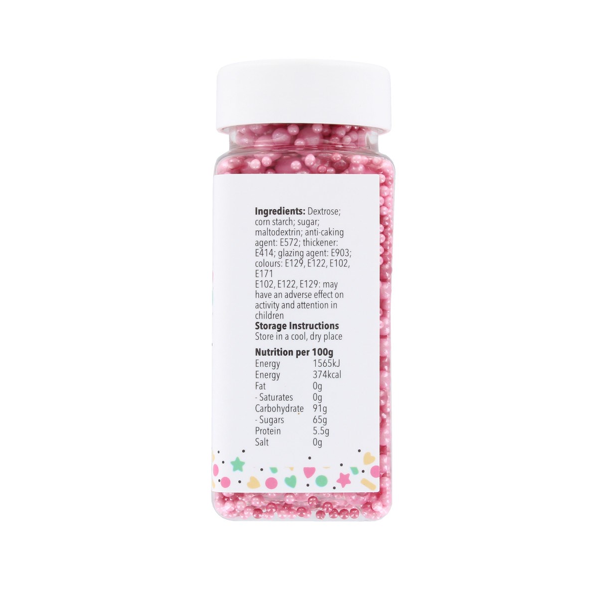 Dextrose; corn starch; sugar; maltodextrin; anti-caking agent: E572; thickener: E414; glazing agent: E903; colours: E129, E122, E102, E171