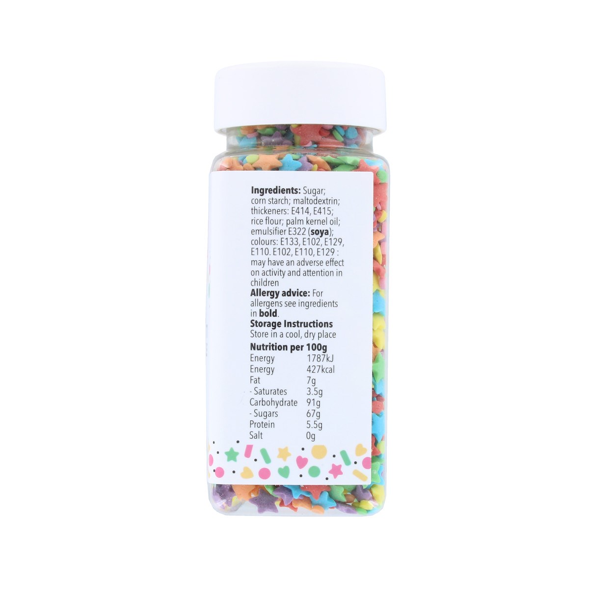 Sugar; corn starch; maltodextrin; thickeners: E414, E415; rice flour; palm kernel oil; emulsifier E322 (SOYA); colours: E133, E102, E129, E110