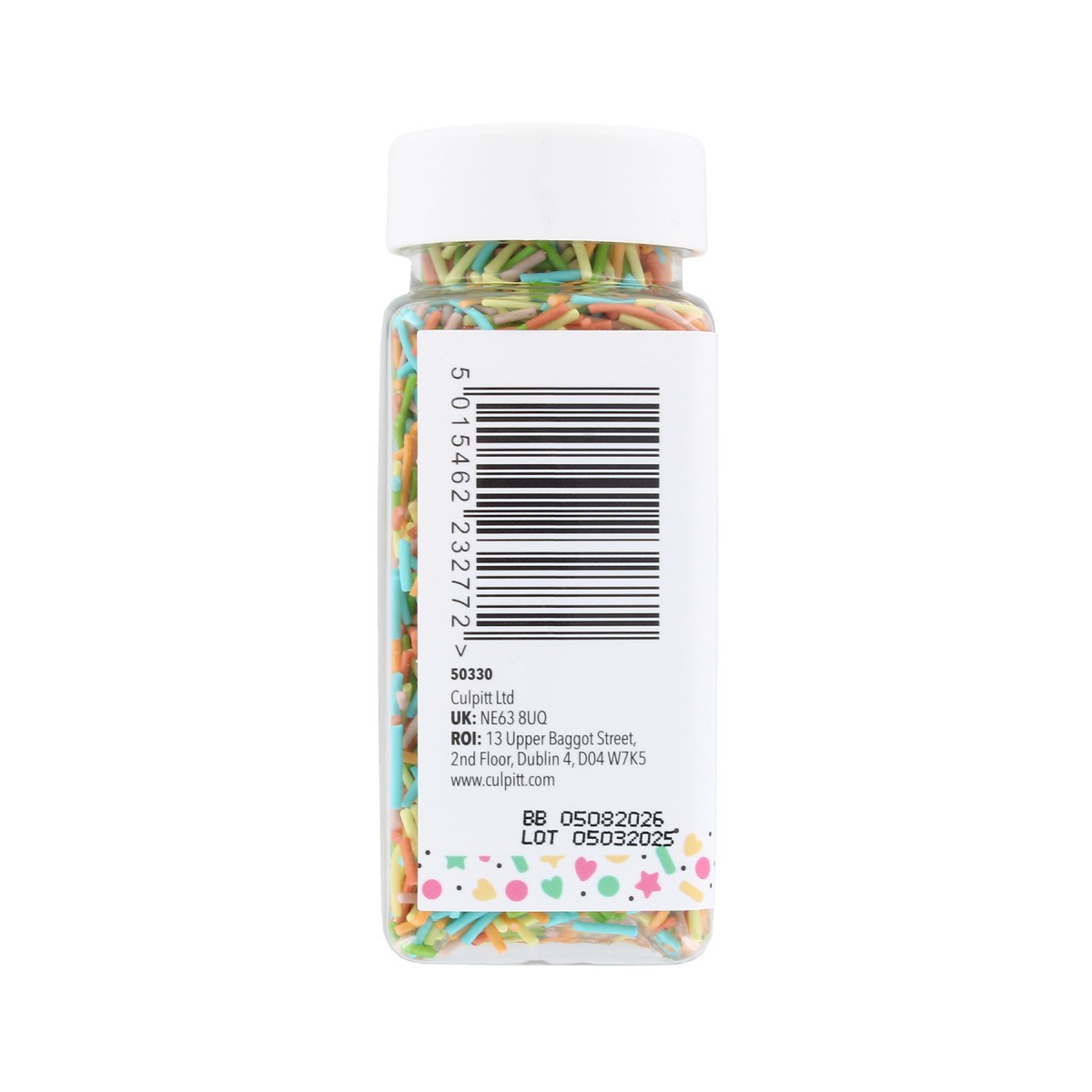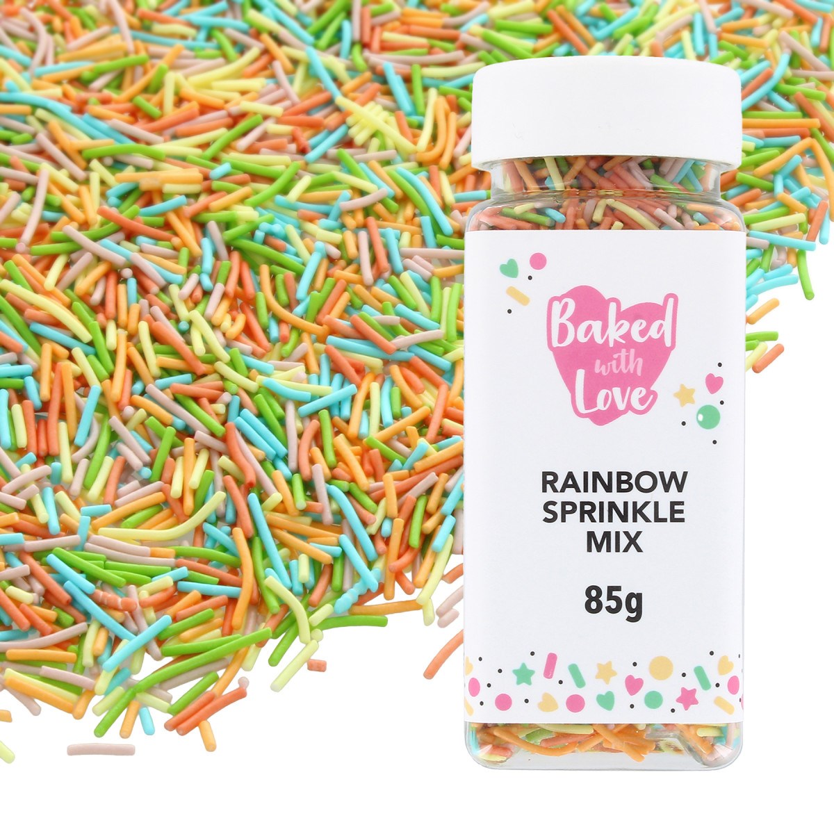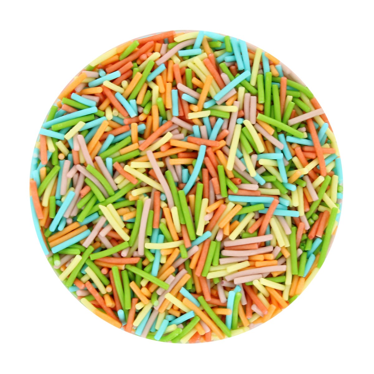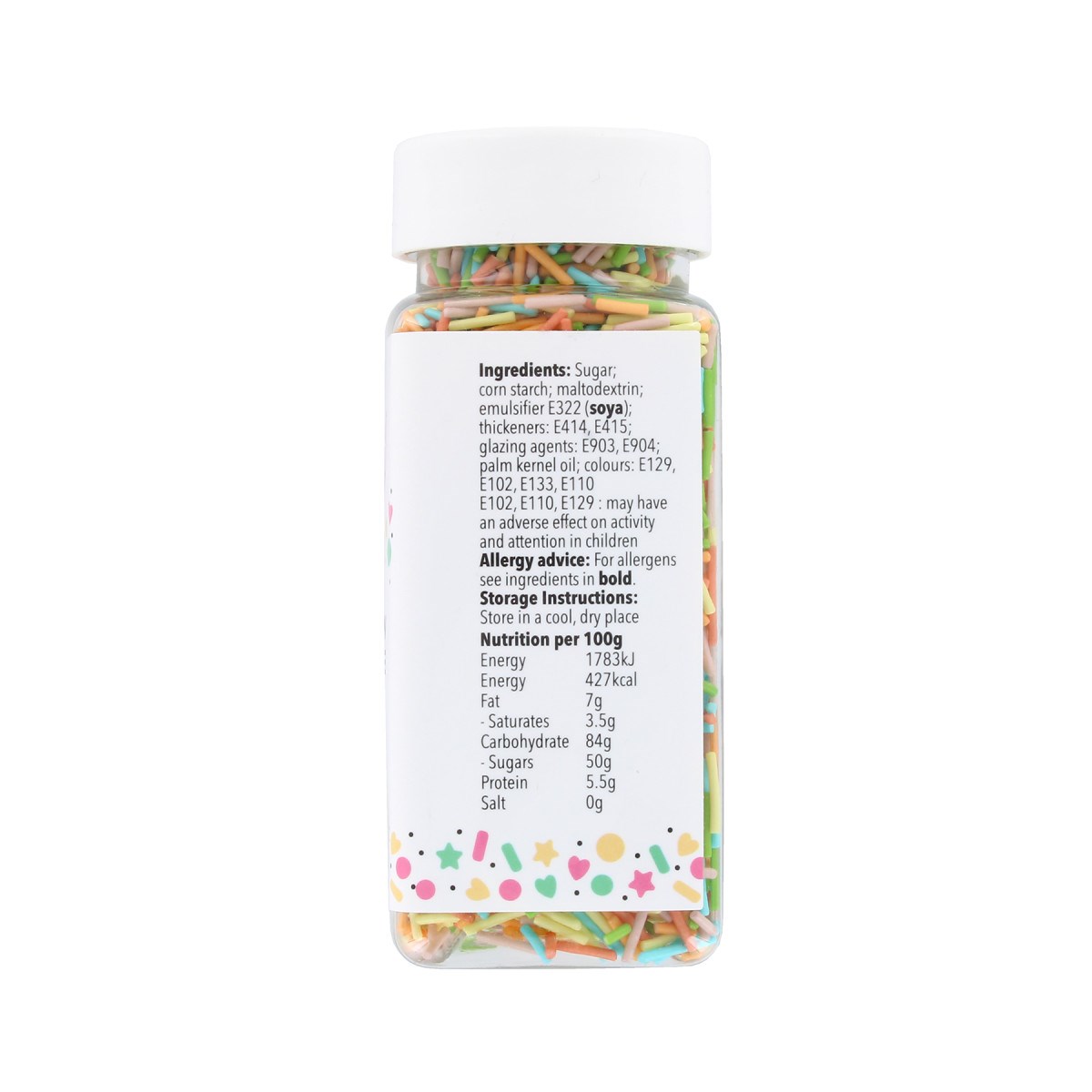 Sugar; corn starch; maltodextrin; emulsifier E322 (SOYA); thickeners: E414, E415; glazing agents: E903, E904; palm kernel oil; colours: E129, E102, E133, E110