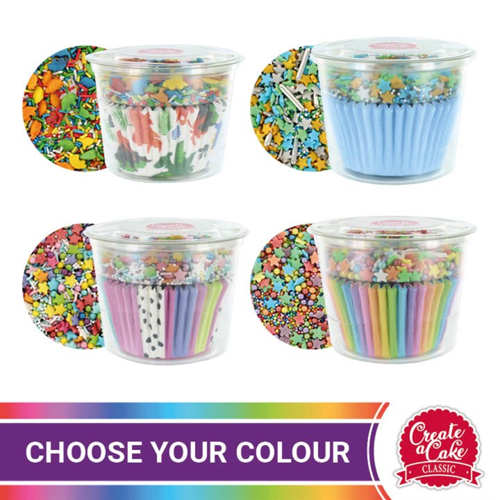 Create a Cake baking cases and sprinkle pods take the effort out of making on trend cupcakes and provide a quick and easy solution for home baking. Just the right combination of 30g of sprinkles to decorate 25 cupcakes in the cases included.