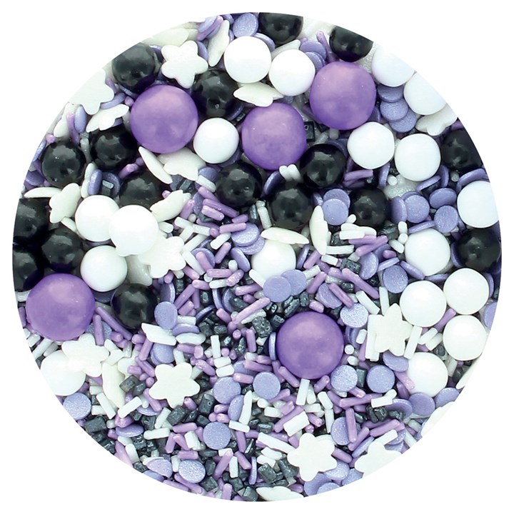 CONFETTI: Sugar; potato starch; sunflower oil; rice flour; colour: E171: glazing agent: shellac: E904. VERMICELLI: Sugar; vegetable oil (coconut); glucose syrup; colour: E171; glazing agent: E901, E904; coconut oil. DRAGEES: Dextrose; maltodextrin; corn syrup; calcium stearate; malic acid; resinous glaze (confectioner's glaze); artificial flavours; tapioca dextrin; carnauba wax; mica based pearlised pigments. CHOCOBALLS: MILK Chocolate (53.1%) (sugar, cocoa butter (20% min), whole MILK powder, cocoa mass, emulsifier: SOYA lecithin; natural vanilla flavouring; cocoa (min 32%); sugar; stabiliser: arabic gum; rice starch; beetroot concentrate; apple extract; lemon extract; spirulina; colour: titanium dioxide E171; glazing agent: carnauba wax, beeswax, shellac E904. SHIMMER SUGAR: Sugar; colours: E153, E171; glazing agent: shellac E904