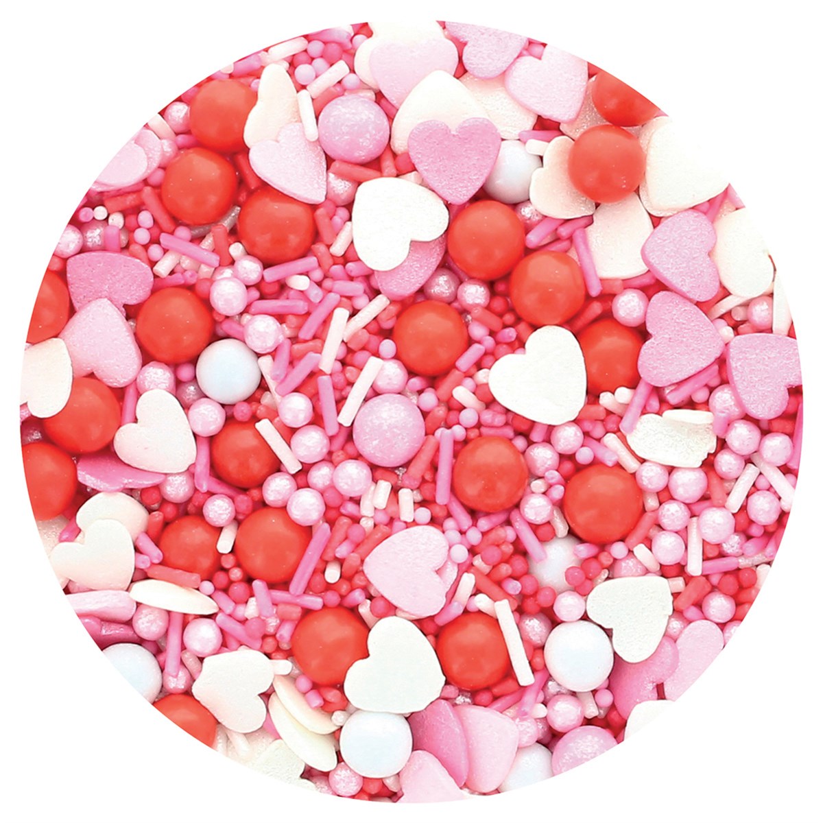 These colourful edible decorations include pearls, dragees, confetti and vermicelli in a romantic colourway, including red, pink and white.