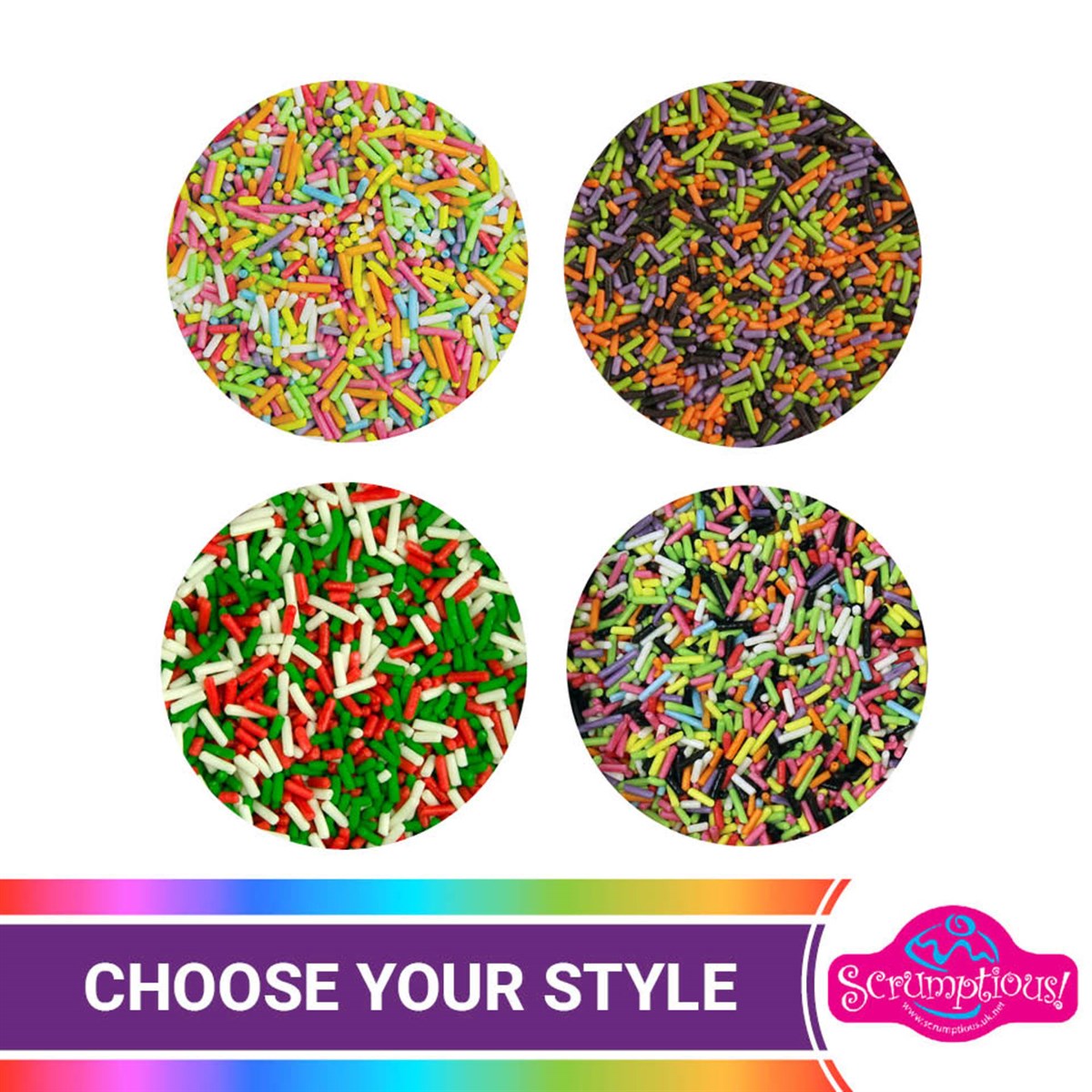 Hundreds and thousands are the classic sprinkle for all ages and are available in a huge range of colours and mixes including Rainbow, Halloween, with black, orange, and green, and purple, Patriotic Red White and Green, or a Multi-coloured mix of all the colours you can imagine.