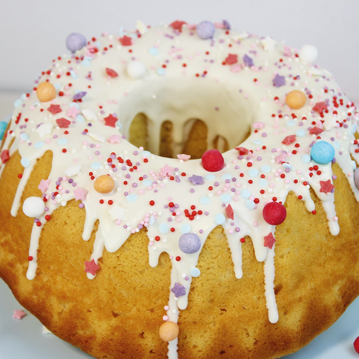 Sugar; corn starch; dextrose; rice flour; hydrogenated palm oil; thickeners: E1412, E415; maltodextrin; flavouring; glazing agents: E904, E903; emulsifier: E322; colours: E100, E120, E133, E160a.