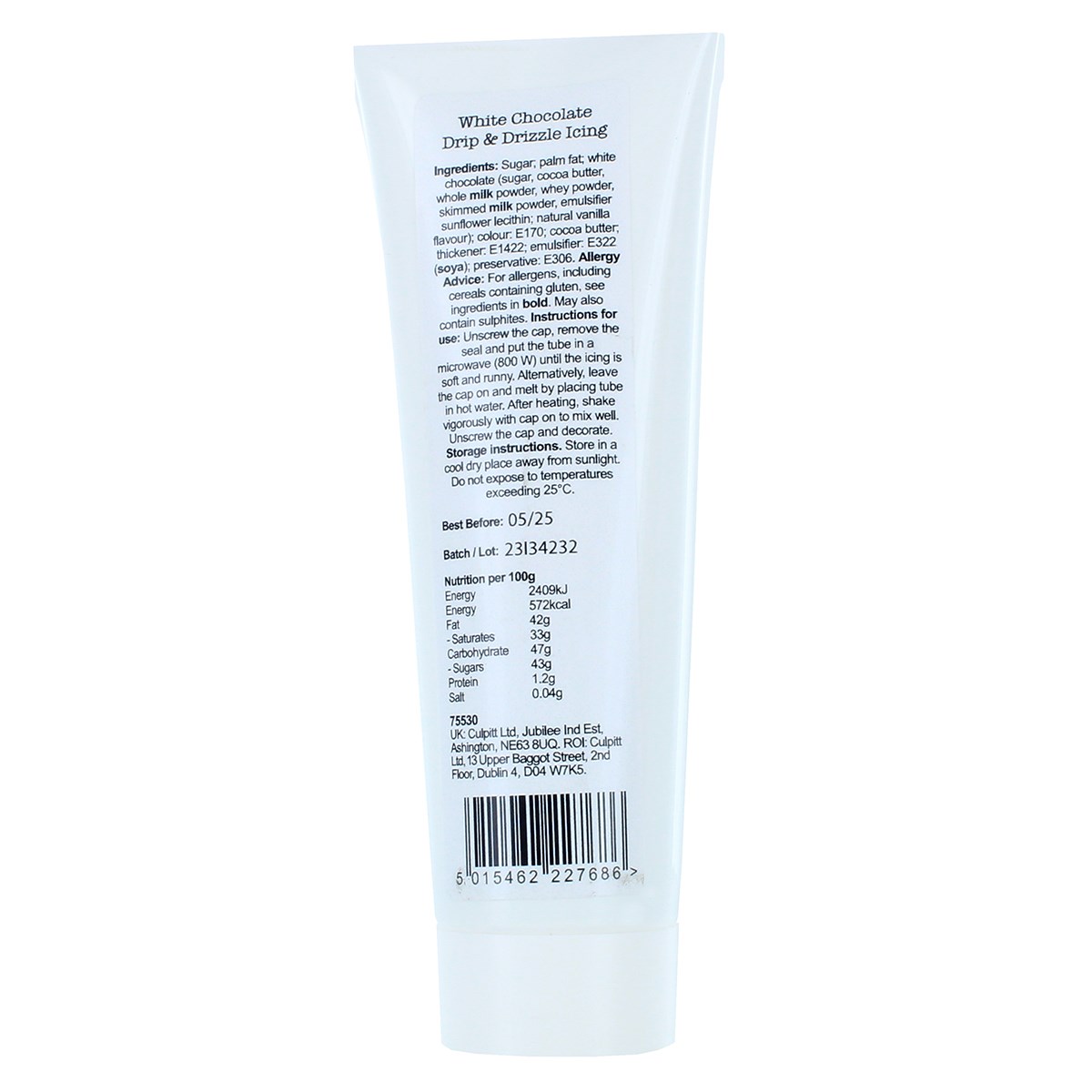 To use, the product must be warmed using a microwave or warm water. For the microwave (800W), unscrew the cap, remove the foil seal and replace the cap. Then place into the microwave for short bursts until the product is melted and can be dispensed. Alternatively, place the tube into warm water (not exceeding 40°C) until the product has melted and can be dispensed. Remove the cap and decorate! As a guide, one tube will cover the top and create a drip effect down the sides of an 8" cake.
