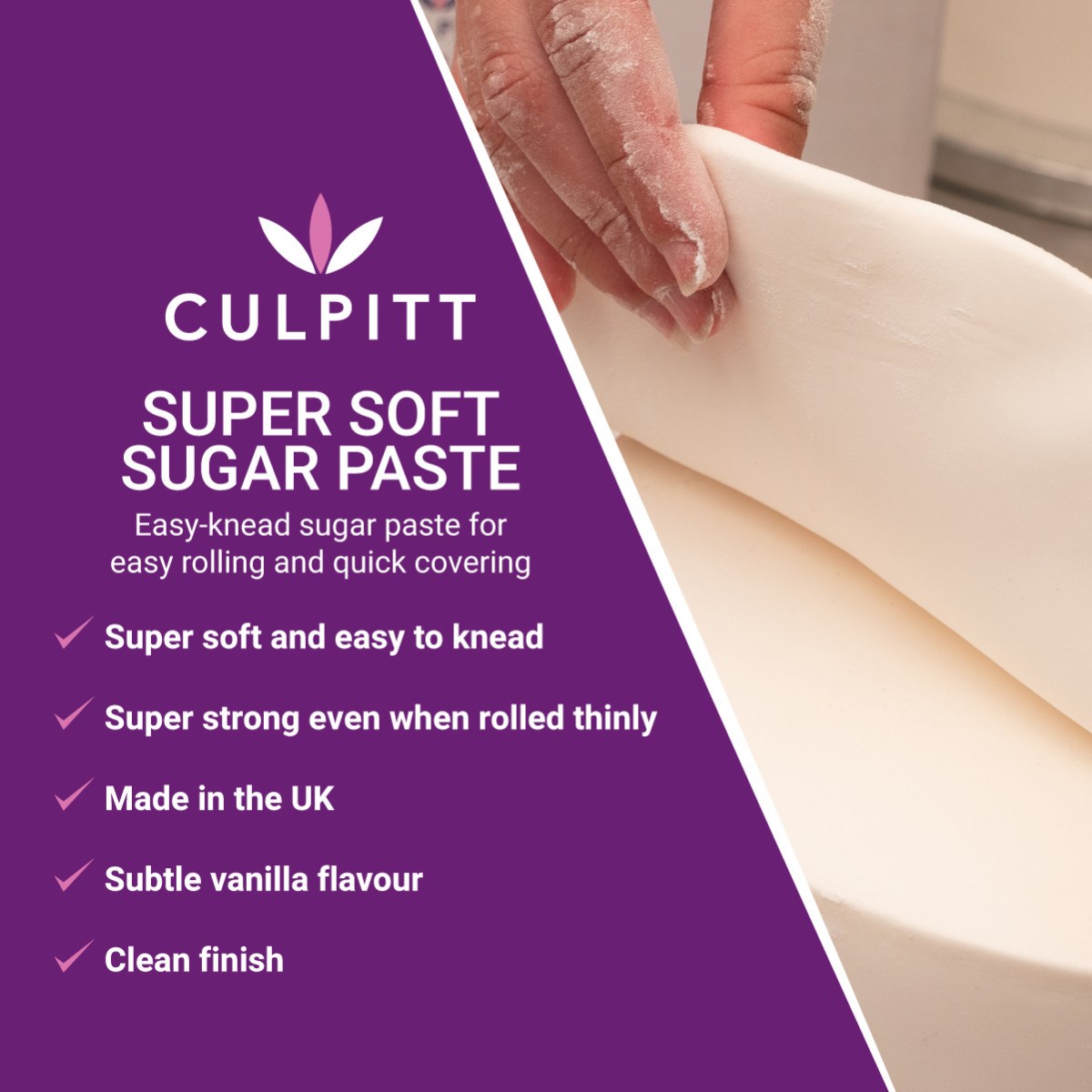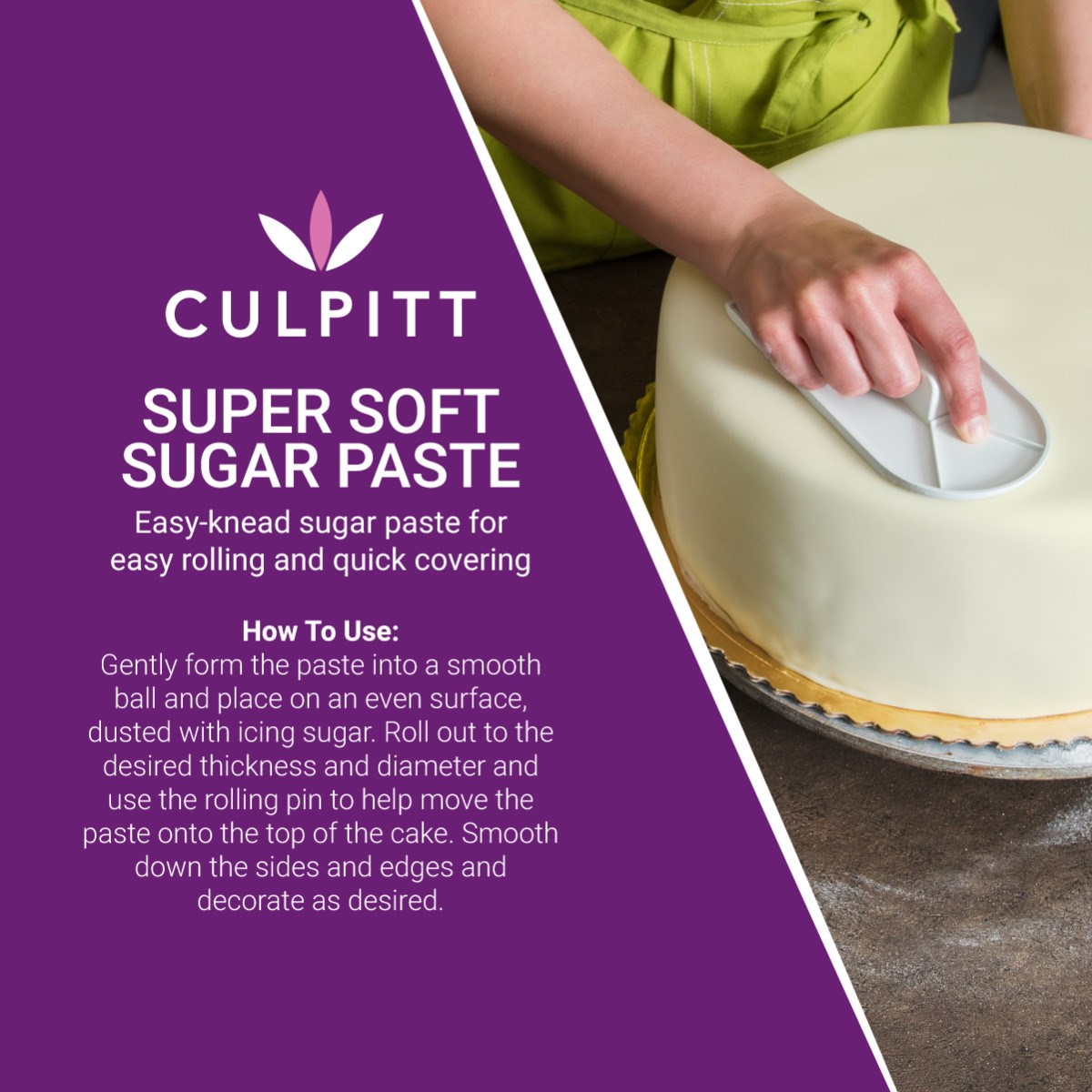 Made in the UK from high quality ingredients, Culpitt super soft sugar paste not only saves time but tastes great too. It has a sweet vanilla flavour which compliments any bake. The easy-to-use sugar paste is flexible and great for quickly covering celebration cakes. For a flawless finish, use a smoother to polish the surface.